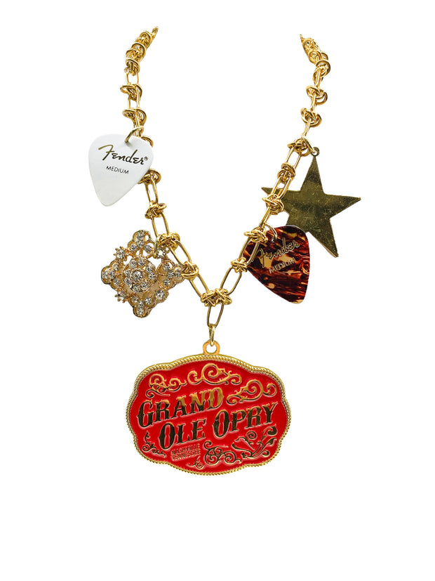 This sophisticated pendant charm necklace features a beautiful gold chain adorned with guitar pick charms, inspired by the iconic Grand Ole Opry. Elevate your style with this unique and elegant accessory.