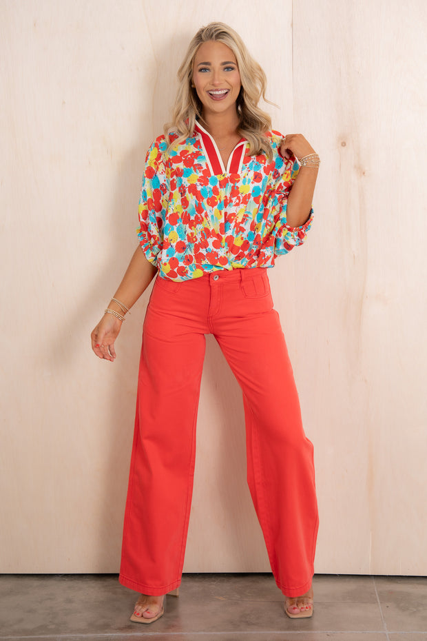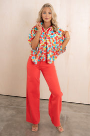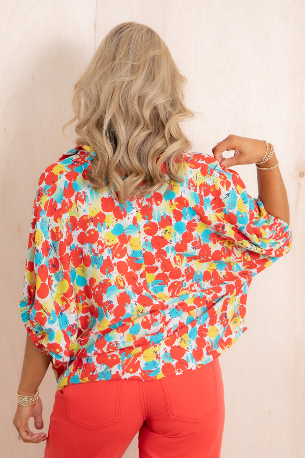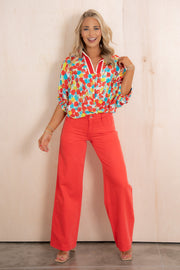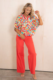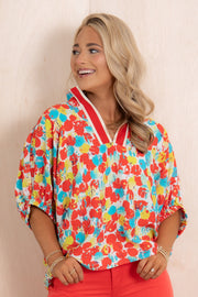 This top combines comfort with style in a vibrant red. Features a structured top collar, flattering v-neckline, and waist-length cut that sits perfectly at your hips. The printed material adds visual interest to this versatile short sleeve piece.