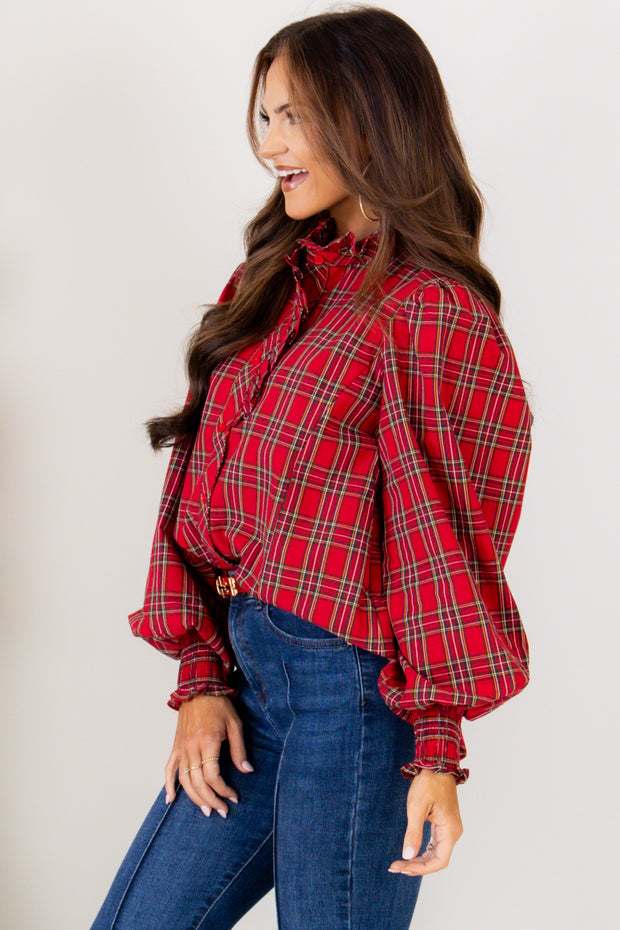 This red plaid blouse features a ruffle neckline, long sleeves, and a waist-length cut with a button-down front, blending classic style with feminine charm.
