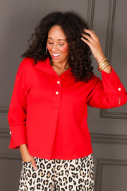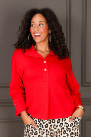 This red long sleeve top is made from soft, buttery fabric for all-day comfort. It features a half-bust button-up design with elegant faux pearl buttons and a structured collar, adding a touch of sophistication to your outfit. Perfect for both casual and dressy occasions.