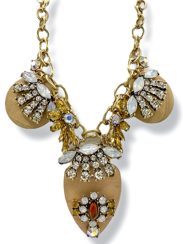 Featuring a unique wooden plate design adorned with a cluster of stones. Perfect for adding a touch of glamour and sophistication to any outfit. Elevate your accessory game with this piece.