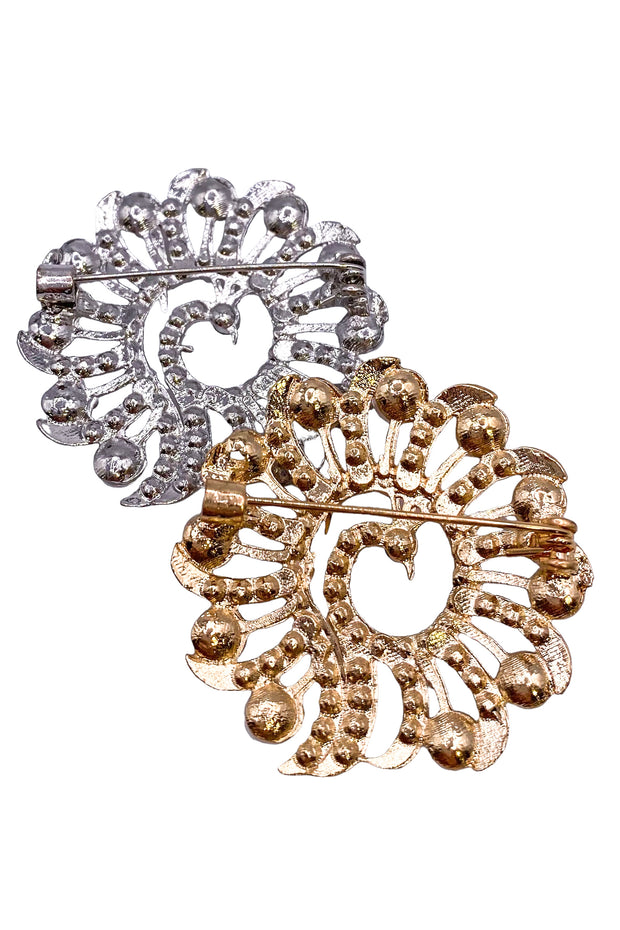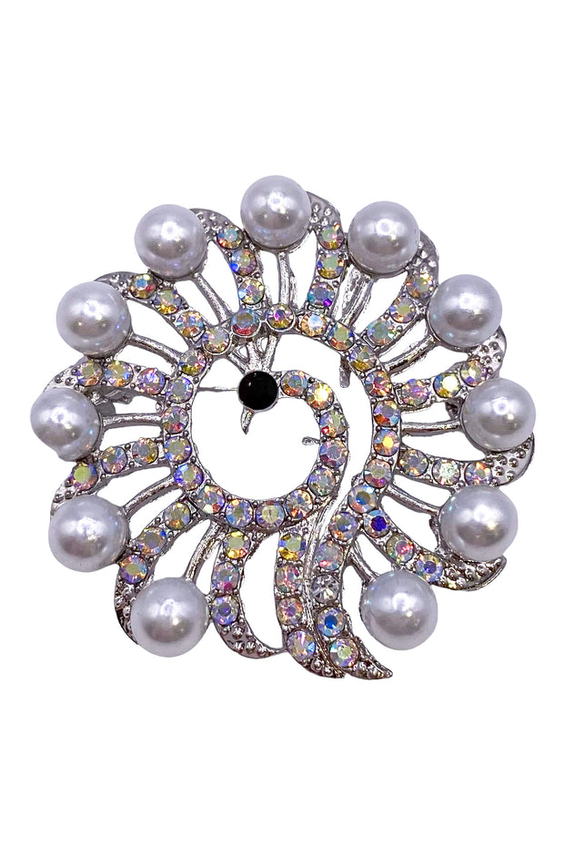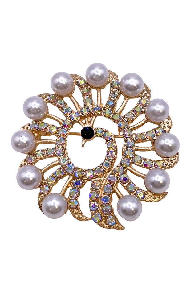 This Peacock Brooch features a stunning outline design adorned with sparkling crystals and delicate pearls. A perfect accessory for adding a touch of elegance and sophistication to any outfit. Expertly crafted for a unique and eye-catching look that will surely make a statement.