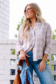 This Top features a classic top collar and long sleeves, offering comfortable coverage. Its waist-length cut and button-down front make it easy to wear and style for everyday looks. The soft lavender plaid pattern adds a subtle touch of color to your wardrobe.