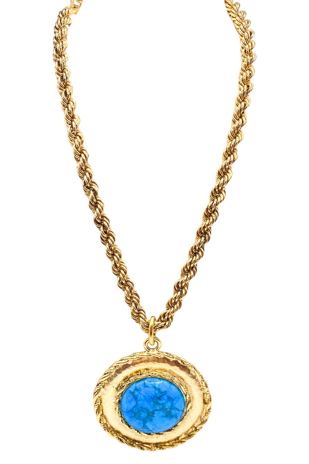 The Around The World Necklace is sure to be a statement piece. Crafted with a delicate rope chain, this exquisite piece features a stunning turquoise stone set in gold. Elevate your style and be the envy of the world with this elegant and unique necklace.