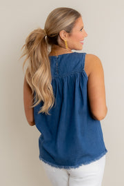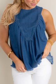 Crafted from premium denim material, this waist-length tank features a sleek rounded neckline and sleeveless design for a sophisticated look.