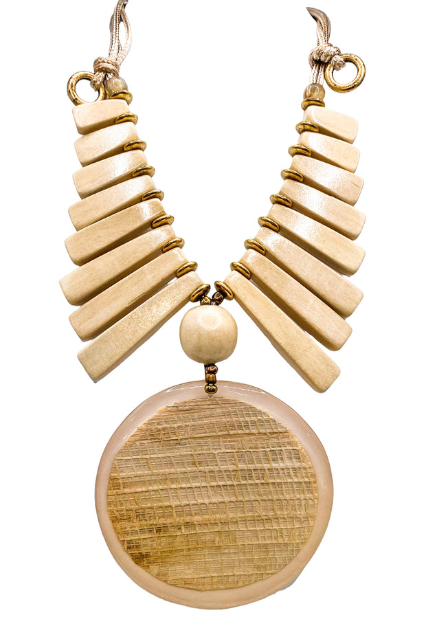 This Coastal Island Necklace features a charming combination of wooden details and a round raffia pendant, creating a beautiful and unique accessory. With its natural and beach-inspired elements, this necklace is perfect for enhancing any outfit and adding a touch of coastal elegance.