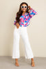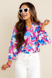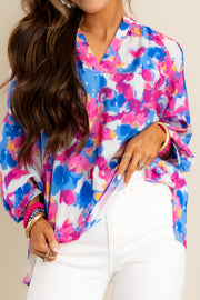 The delicate v-neckline and long sleeves elevate the printed material, while the waist length and boxy silhouette provide a flattering and luxurious fit. This top exudes sophistication and will elevate any look with its refined and exclusive style.