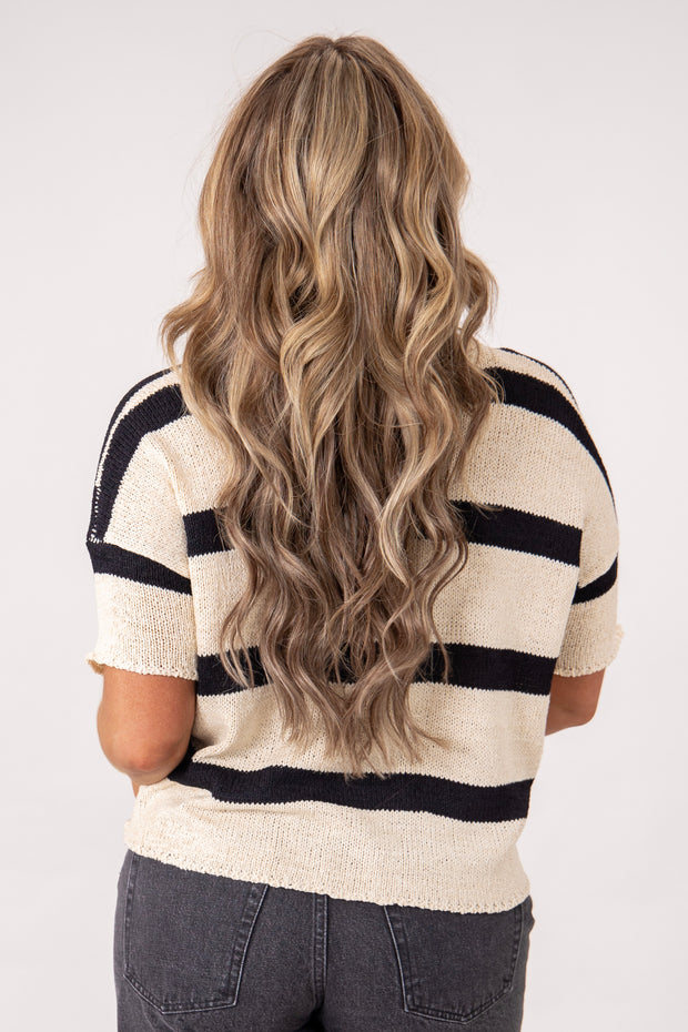 Expertly crafted with soft, knitted material, our Second Chances Sweater features a rounded neckline and short sleeves for a comfortable fit. The timeless striped print adds a touch of style and versatility, making it the perfect addition to any wardrobe.