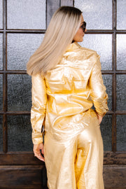 Our linen shirt is the perfect elevated statement piece to have on your wardrobe. It is made of 100% organic linen with a metallic foil print, and its curved hemline is longer on the back for a super flattering silhouette. Wear it open over a white Mar Crop Top and roll up the sleeves to just below the elbow for a carefree chic vibe.