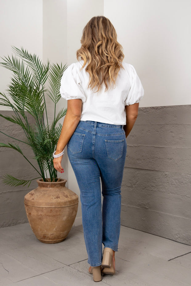 The Sasha Jean features a convenient zip button closure and side pockets, making it perfect for everyday wear. Its flare length creates a flattering silhouette, while the rhinestone detailed hem line adds a touch of sparkle. Available in a medium wash, these jeans are a must-have addition to your wardrobe.