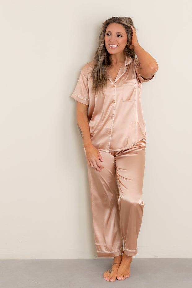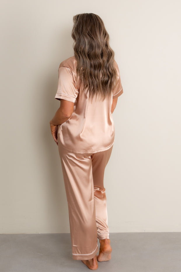 Made from smooth satin material, this set features short sleeves and a button down front for a classic yet elegant look. The pull-on waistband ensures comfort and ease, making it perfect for a good night's sleep.