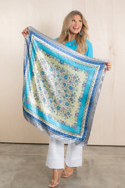 Featuring a stylish abstract paisley pattern that is printed on a square silky satin fabric. With its versatile design and luxurious material, this scarf can be worn in various ways and adds a touch of elegance to any outfit.