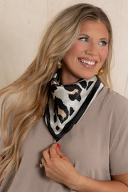 Enhance your style with our Wild Child Ivory Scarf. This square scarf features a bold leopard print pattern that adds a touch of edginess to any outfit. Let your wild side shine through with this must-have accessory.