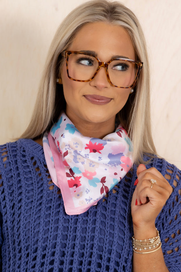 This Your Girl Pink Scarf features a beautiful Pastel Meadow Floral print on a silky satin material. Enjoy the luxurious feel and vibrant design of this square scarf, perfect for adding a touch of elegance to any outfit.