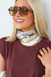 This elegant scarf features a geometric knot print on smooth, satin fabric. Its lightweight and silky texture makes it perfect for adding a touch of sophistication to any outfit, whether tied around the neck, hair, or handbag.