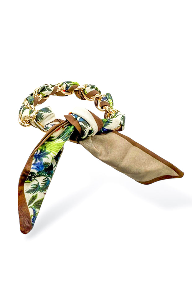 This playful accessory combines silky fabric and gleaming metal for a look that's both fun and fashionable. Mix and match with your favorite outfits for a pop of personality that won't go unnoticed.