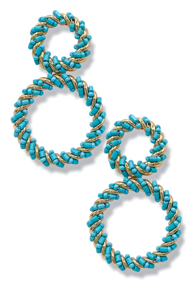 Made with a delicate combination of seed beads and metal circles, these earrings exude artful sophistication. Let their vibrant turquoise color and unique design elevate your style.