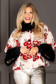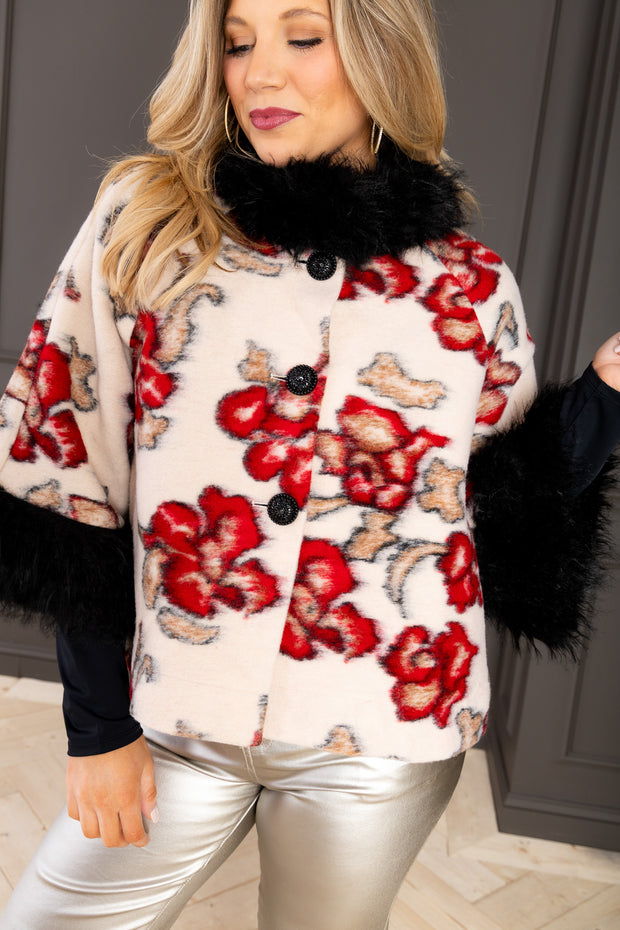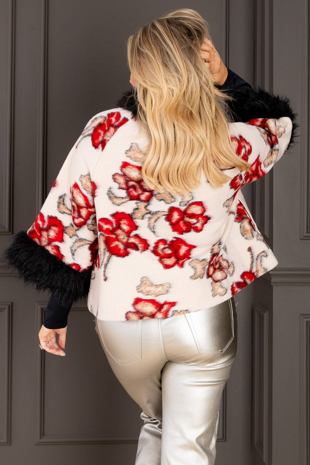 Elegant ivory jacket featuring a luxurious faux fur collar, long sleeves, and flattering medium length. Delicate rose detailing adds romantic charm to this versatile layering piece.