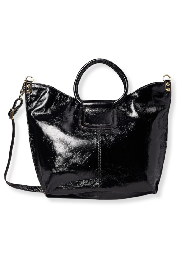 The HOBO Sheila Black Tote boasts a polished sheen on its leather material, complemented by a roomy interior and various pockets to keep your belongings neatly arranged and immediately accessible.