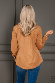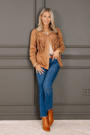 This long sleeve top features brown suede-like fabric with a button-down front, fringe details, a V neckline, and a pop collar. It offers a stylish, textured look perfect for casual or layered outfits.