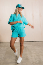 The rounded neckline and short sleeves provide a comfortable fit, while the ribbed material adds texture and style. The pull on waistband and side pockets make this set practical and convenient for everyday wear.