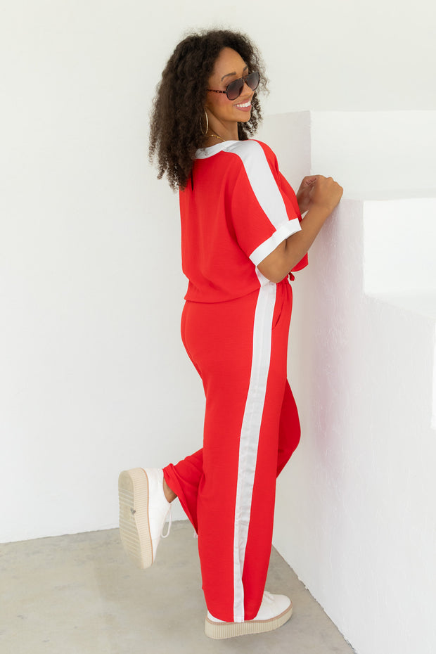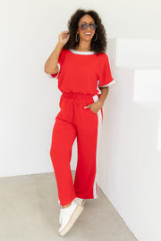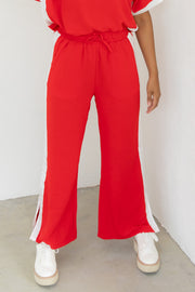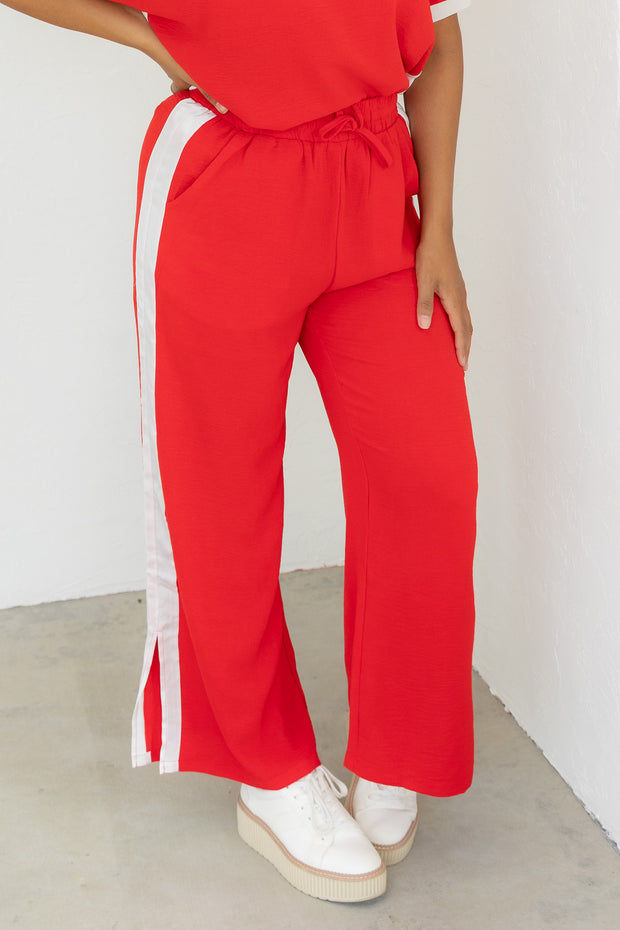 These red wide leg pants feature an elastic pull-on waist with an adjustable drawstring for a comfortable fit. White stripes run along the sides, and side pockets to add fun and functionality.