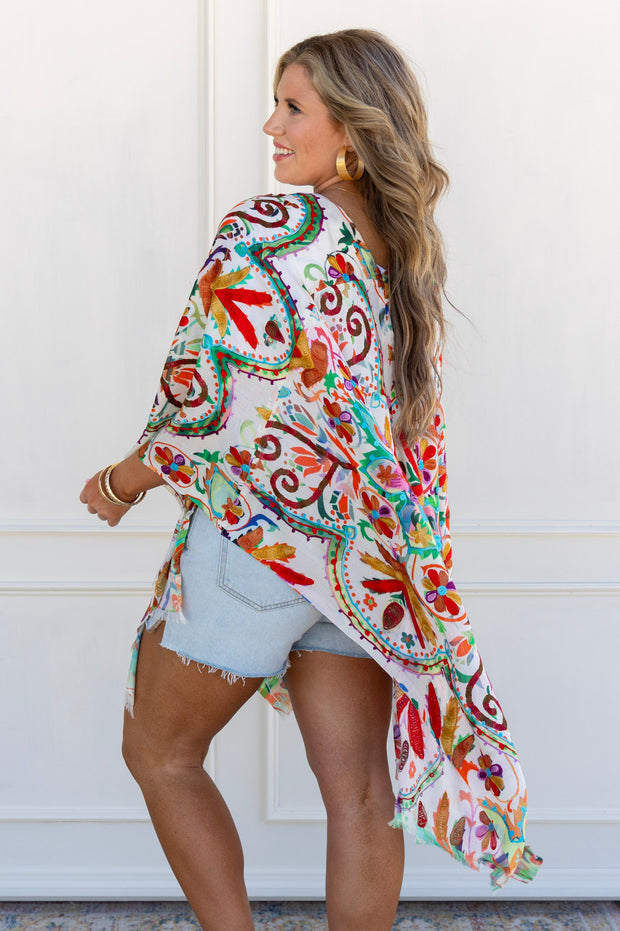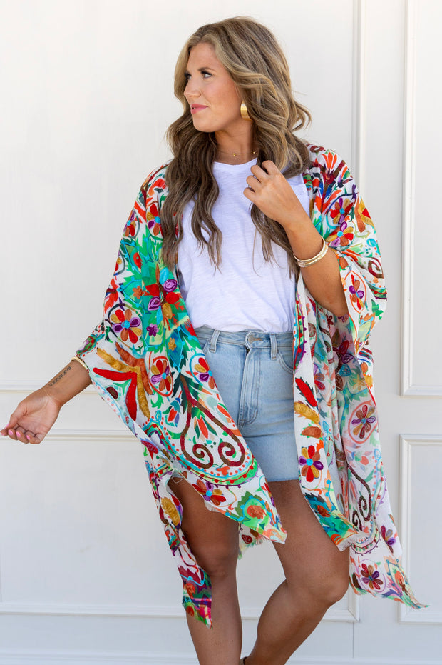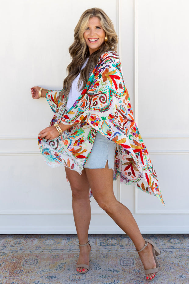 The Walk in the Garden Kimono boasts a relaxed fit and beautifully embroidered flowers, creating a stunning and comfortable garment. Perfect for adding a touch of elegance to any outfit.
