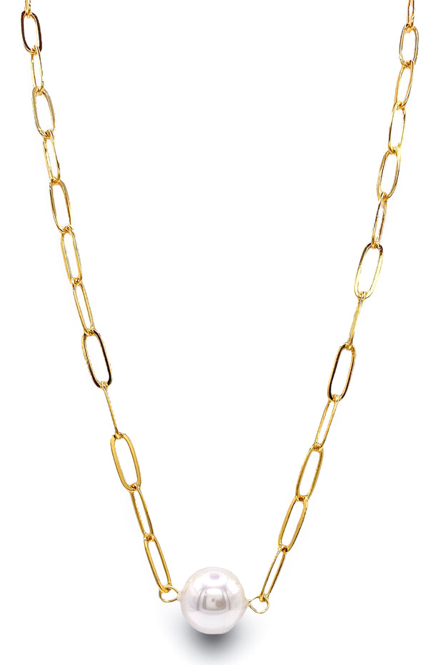 This elegant necklace from Treasure Jewels features a delicate paperclip chain adorned with a single, lustrous pearl. The perfect accessory for showcasing sophisticated and refined style. Elevate any look with the timeless beauty of the Cora Necklace.