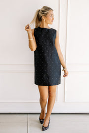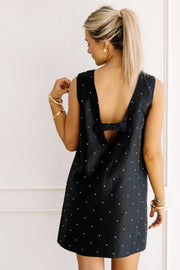 The Elegance of Time mini black sleeveless dress features sparkling rhinestones scattered throughout and a charming bow at the back, combining style and graceful sophistication.