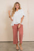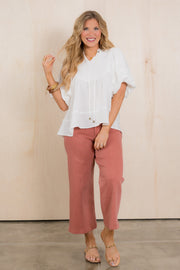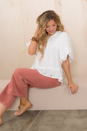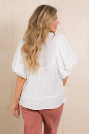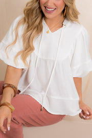 This white puff short sleeve top has a v neckline and an oversized fit, with breathable material that makes it comfortable to wear. The puff sleeves add a touch of elegance, while the waist length provides a flattering silhouette.