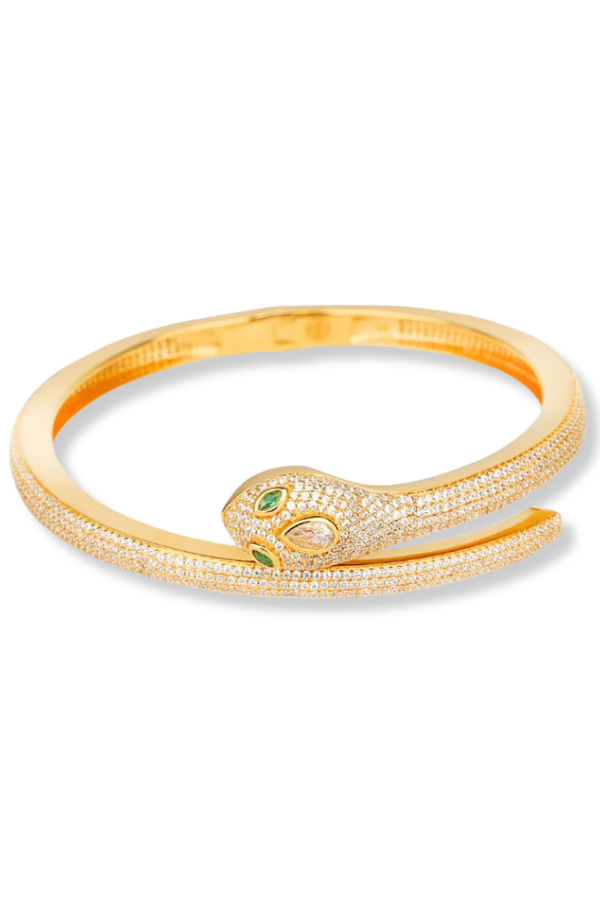 Embrace transformation with the BuDhaGirl Snake Pavé Bracelet. This shimmering golden serpent, adorned with sparkling crystals and emerald eyes, wraps elegantly around your wrist.
