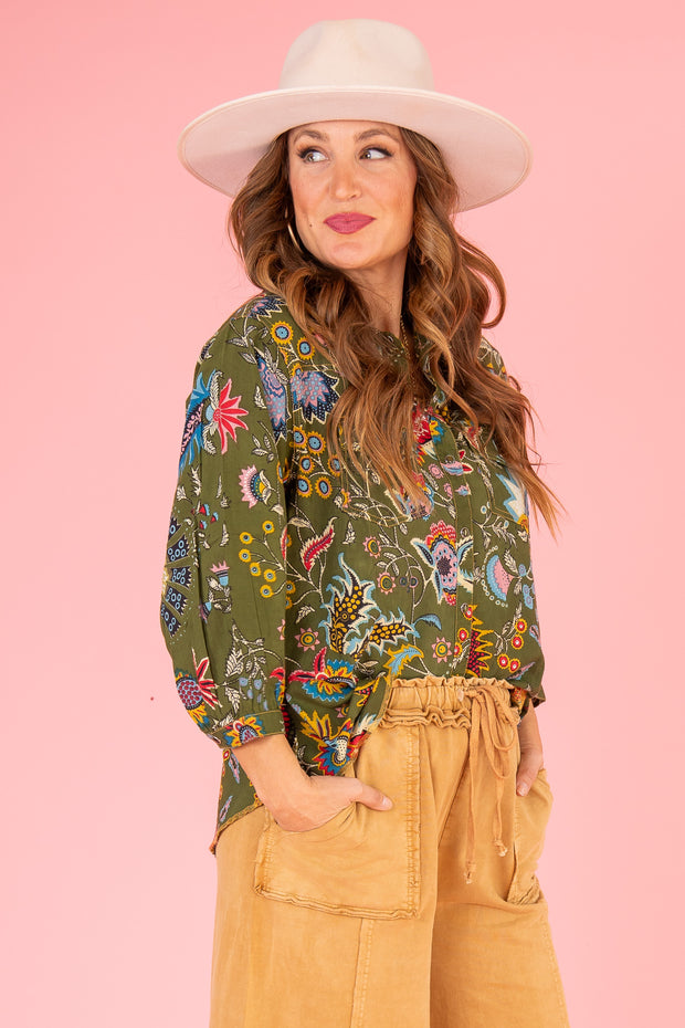 This sophisticated blouse features a top collar, three quarter length sleeves, and a button down front. The abstract floral print offers a unique finish to its timeless look. Perfect for special occasions or everyday wear.