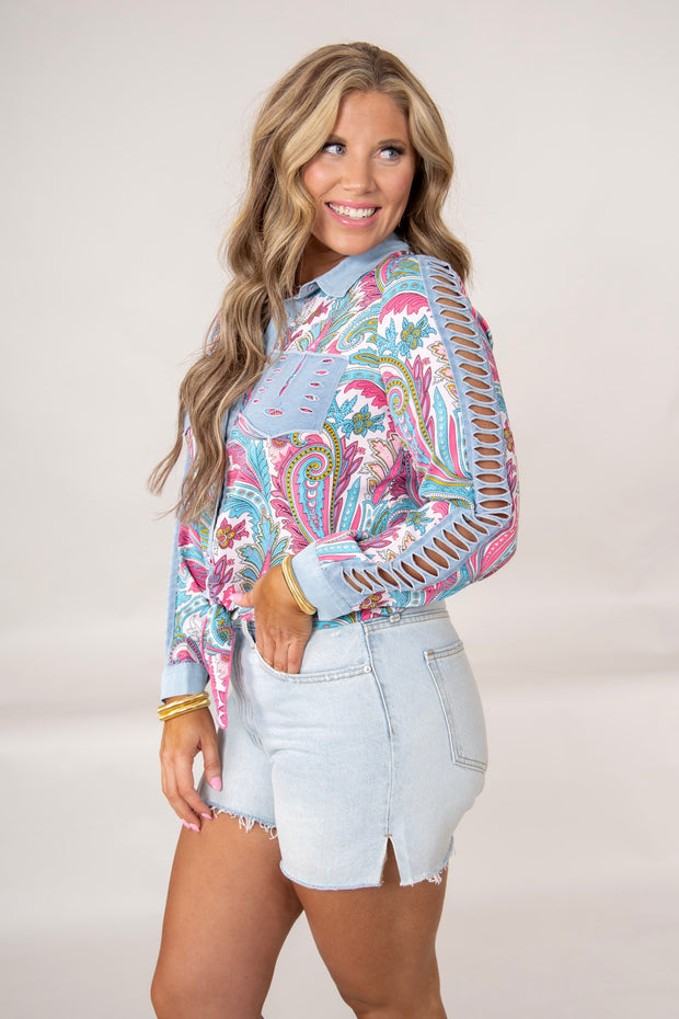 Be a trendsetter in the stylish and versatile Sonia Top. With unique cut out details and a flattering button up design, this top will add a pop of color to any outfit. Perfect for any occasion, its vibrant print is sure to turn heads. Expertly crafted for comfort and style.