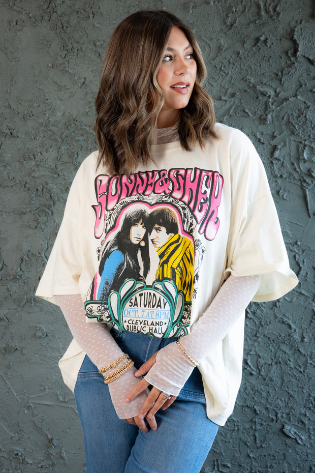 Sonny met Cher, and Cher met Sonny. America’s favorite power couple found fame riding the wave to pop stardom hand in hand. Sonny & Cher are a duo so dynamic their captivating power long lives their career on a new OS Tee featuring an image of the icons with their Cleveland Public Hall show details.