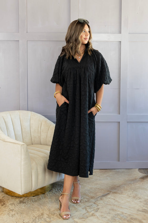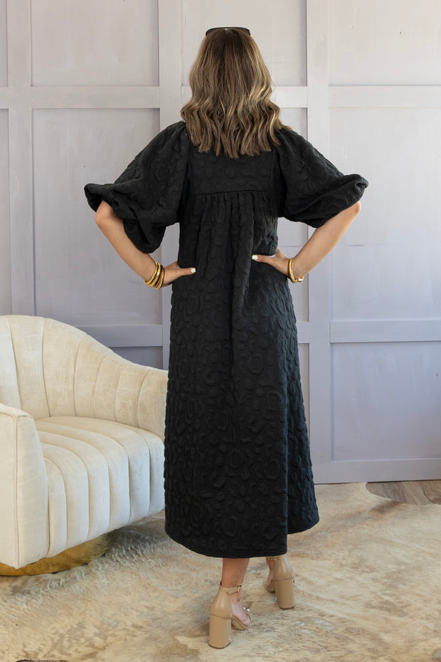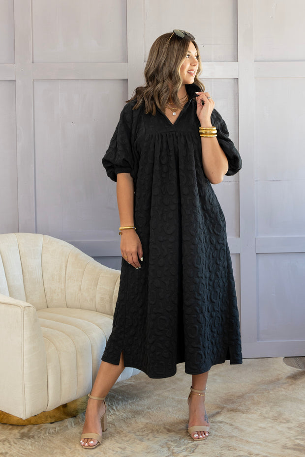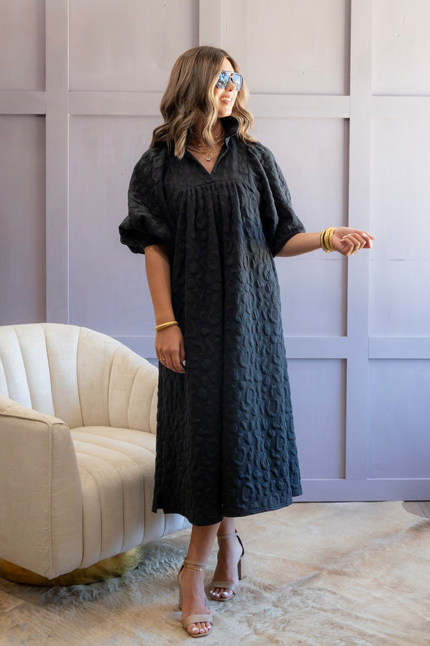 Introducing the Stella Midi Dress, designed by Emily McCarthy. This elegant dress features a flattering v-neckline and short sleeves, perfect for any occasion. Its midi length adds a touch of sophistication, while the textured leopard print gives it a unique and stylish look. Elevate your wardrobe with this must-have piece.