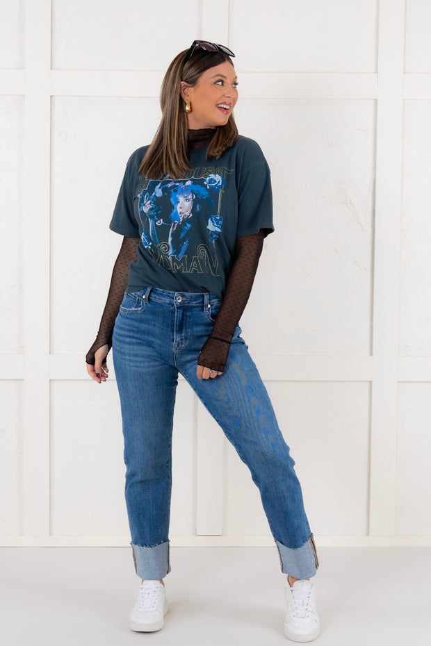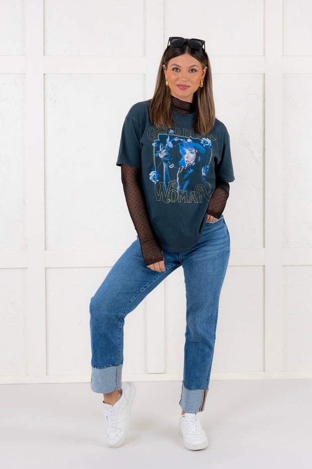 Ready for your rotation, an ethereal portrait of Stevie Nicks framed in gold metallic ink hits this Weekend Tee. Inspired by “Gold Dust Woman,” the song written and sung by Nicks with a title named after the street in Arizona where she spent some of her childhood, Gold Dust Lane, this tee holds an extra level of nostalgia.