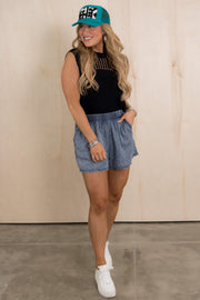 These luxurious shorts feature an elastic pull on waistband for the perfect fit, convenient side pockets, and dazzling rhinestone detailing. The denim like look adds a touch of sophistication to any outfit.