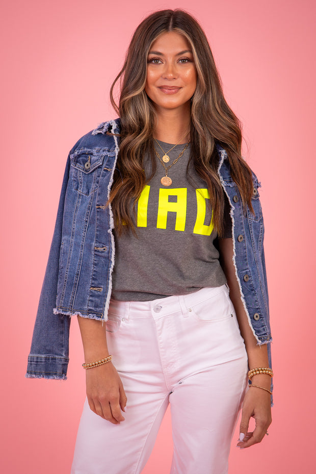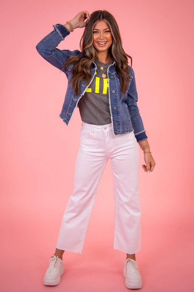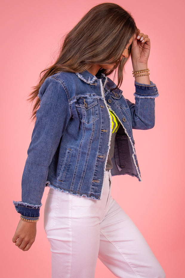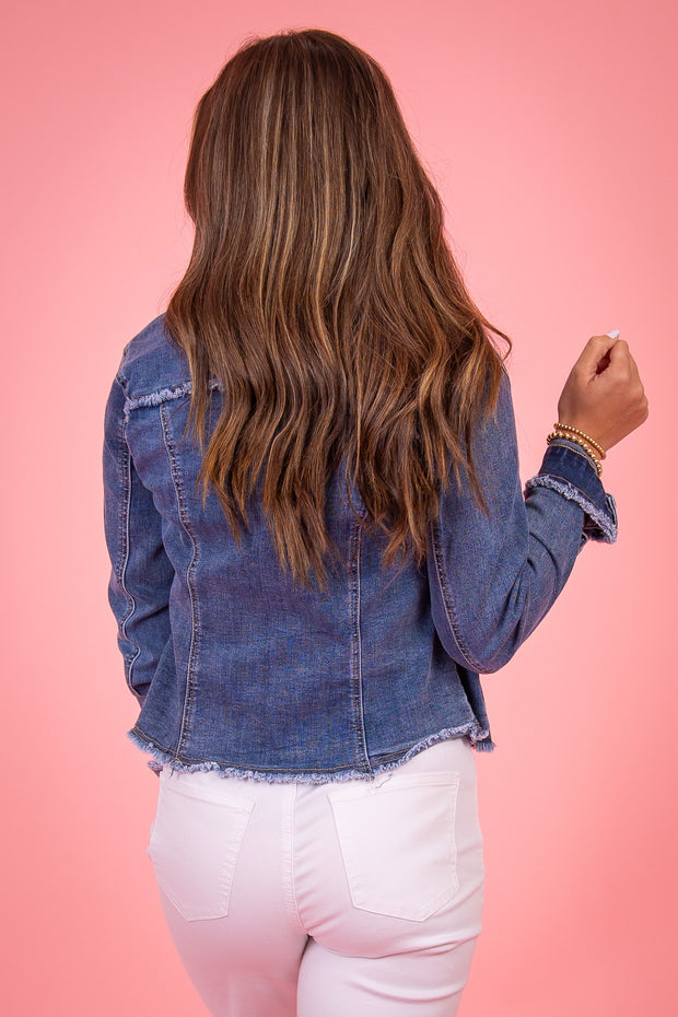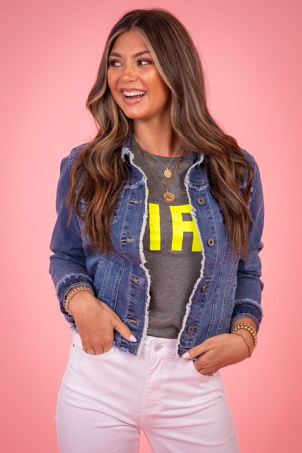 Discover the ultimate blend of style and comfort with our On Tour Denim Jacket. Featuring a top collar, button down front, and front pockets, this jacket is both functional and fashionable. With its long sleeves and distressed detailing, you'll be sure to make a statement wherever you go.