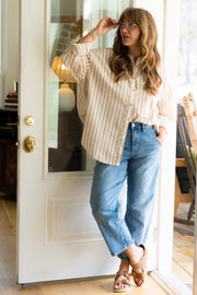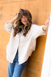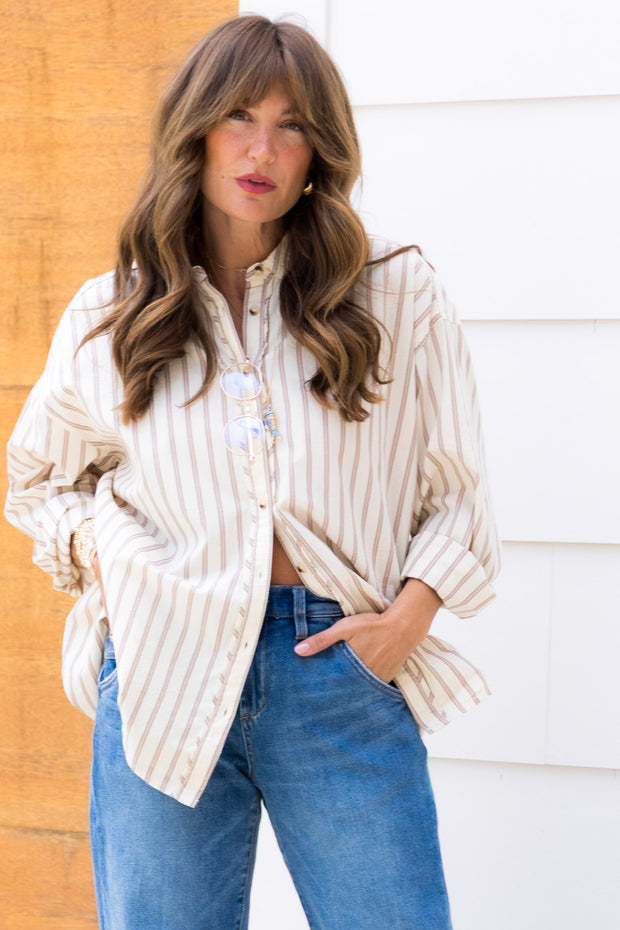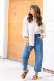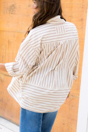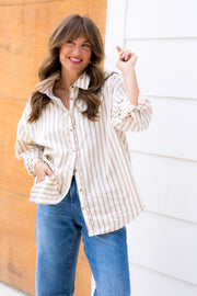 This Free People shirt boasts an elevated style with its top collar and sophisticated button down front. The blue striped print adds a touch of finesse to the long sleeves, making it an essential piece for any luxury wardrobe.