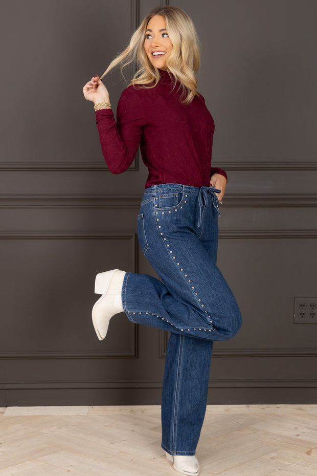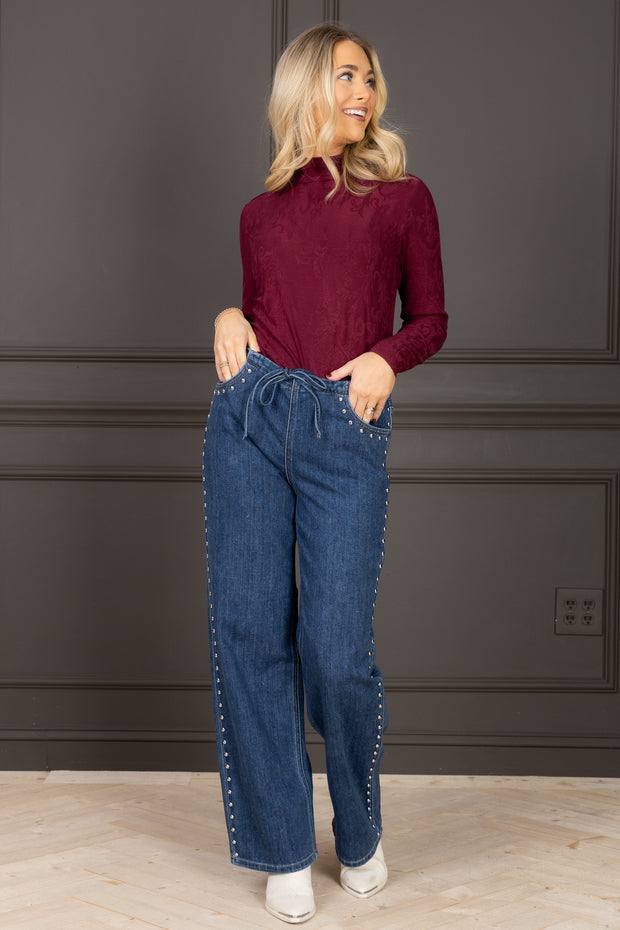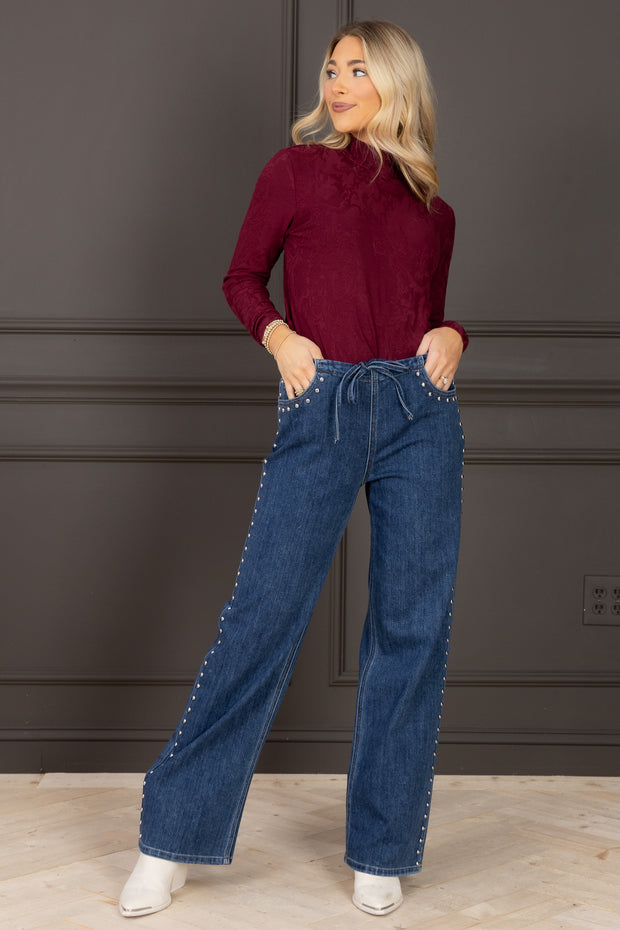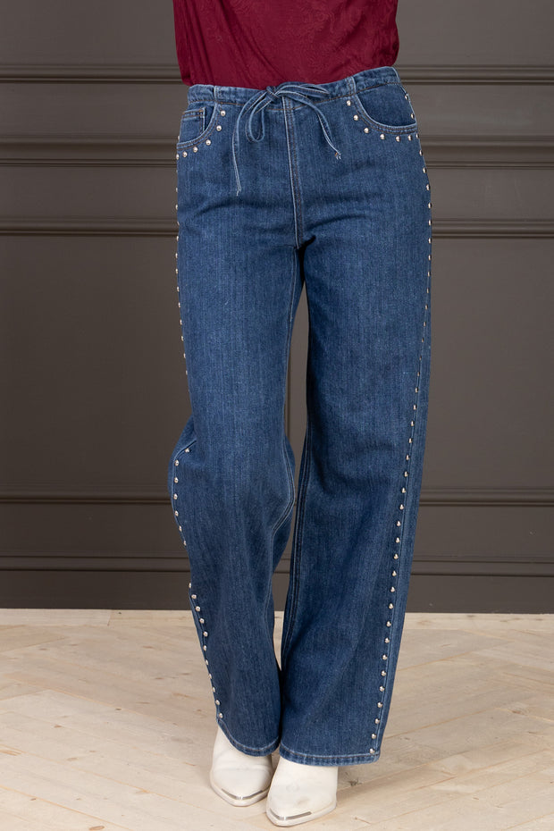 Effortless style meets edge. Dark denim wide legs feature studded detailing, adjustable waist tie, and functional pockets for everyday versatility.