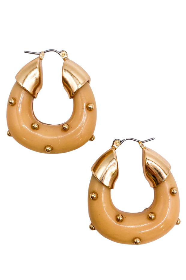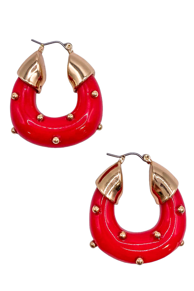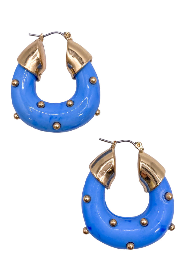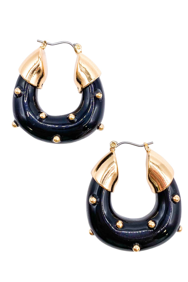 The Getting Away Earring is a stunner. This earring is an acrylic hoop that is studded with metal balls. Perfect for special occasions or everyday wear! This earring comes in two great color options!