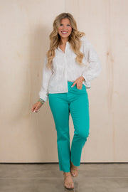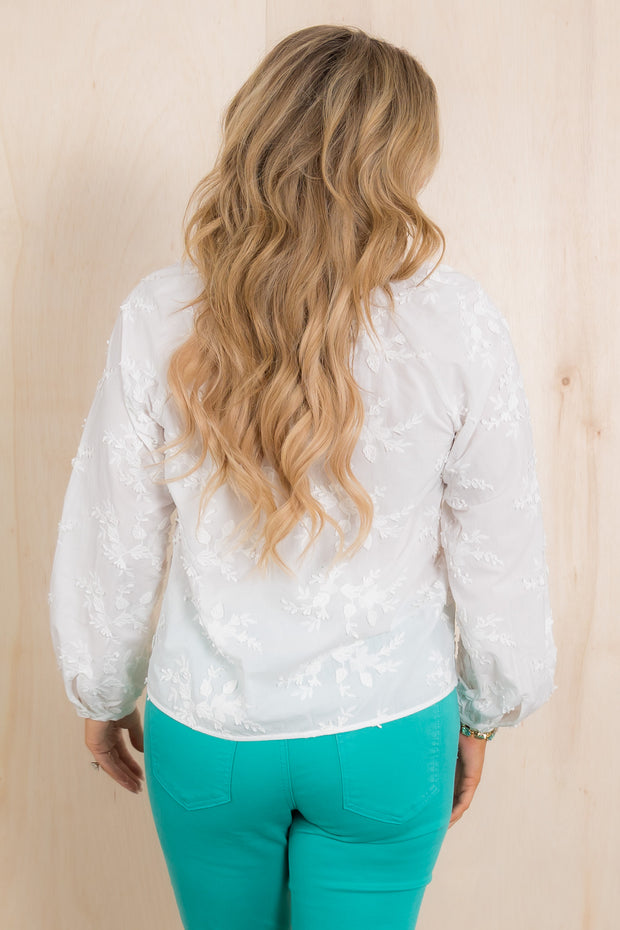This versatile top features a rounded neckline, button down front, and delicate floral detailing. Designed with long sleeves and a waist length, it offers both style and comfort for any occasion.