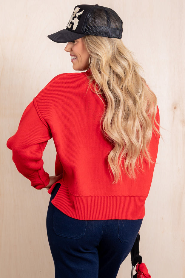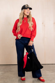 This Ruby red long sleeve sweater is made from butter-soft material, offering comfort and warmth. Its versatile design makes it perfect for any occasion.