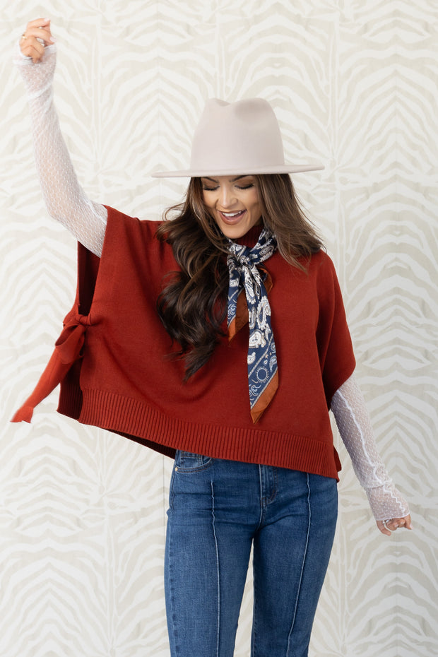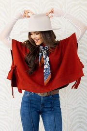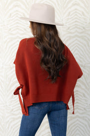 The Come Together Fall Red Short Sleeve Sweater features a round neckline and a side tie to adjust for a comfortable fit. Its sleeveless design and warm red color make it perfect for layering during cooler fall days.