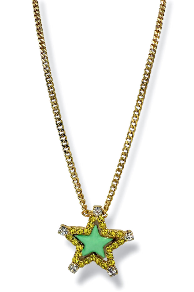 Make a statement with this Sweet Star Necklace in Mint! Show off your personality with its antique gold plated brass base metal, high quality crystals and hand painted enamel add an extra touch of glam. 16" in length and 4" extension. Designed and made in Canada.