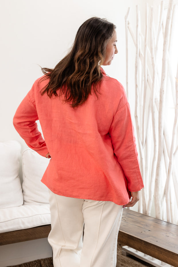 Crafted from high-quality linen material, the Making Moves Swing Shirt offers an elegant silhouette with long sleeves and a top collar. Its button-down front creates a classic and sophisticated look, making it a versatile piece for any occasion. Elevate your wardrobe with this timeless salmon-colored shirt.