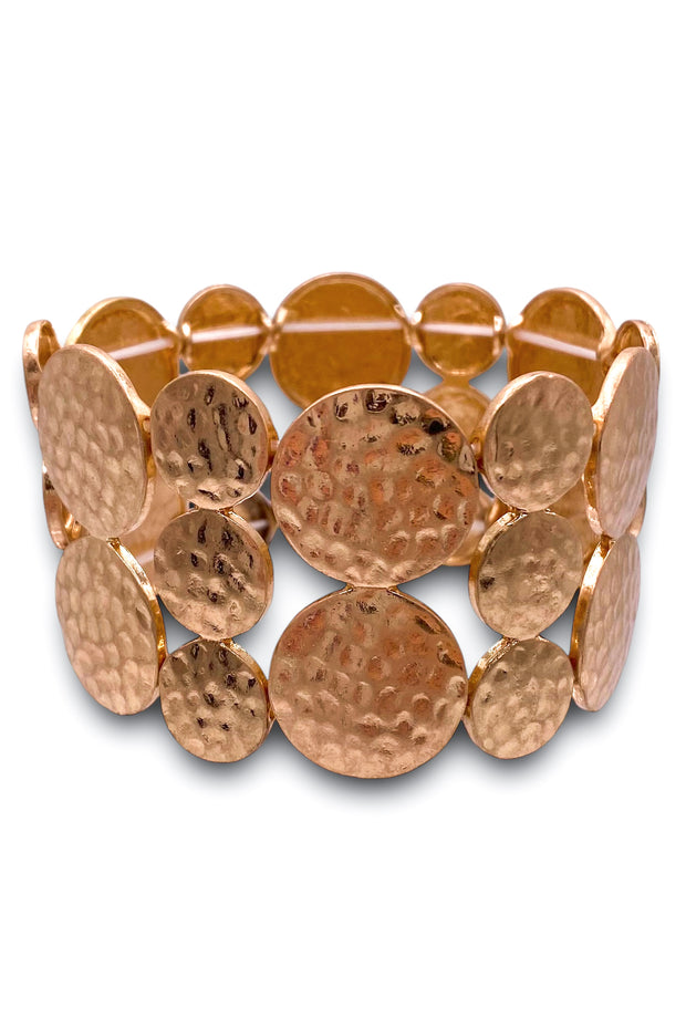 Expertly crafted, the Full Moment Bracelet in gold boasts a textured metal disk design that's both stylish and functional. With its stretch feature, this bracelet ensures a comfortable and secure fit. Elevate your look with this versatile accessory, perfect for any occasion.