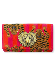 The clutch features pink and orange velvet stripes with fierce tiger illustrations. The inside of the clutch is lined with bright pink linen and it topped with a gold and black “liger” hardware piece. It contains accordion sides with grommets for a removable chain (chain is sold separately). Overall dimensions are 12” x 7” with a magnetic snap closure