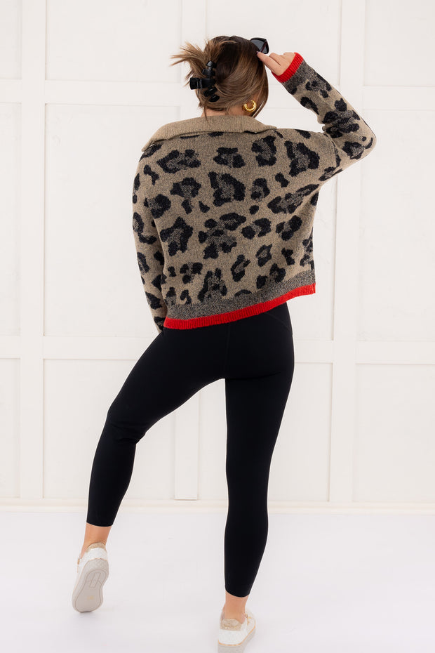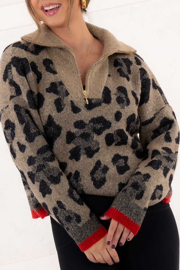 Expertly crafted from cozy sweater material, the Dreams Of You Half Zip Sweater features a top collar and a zip down v-neckline, adding a touch of sophistication to your wardrobe. The playful leopard print adds a trendy touch, while the long sleeves keep you warm and stylish.