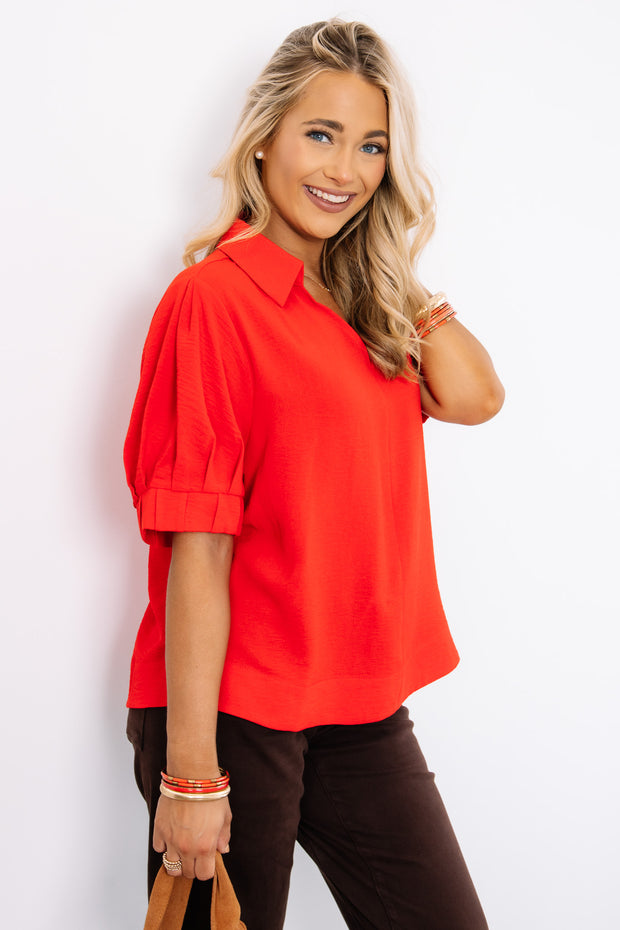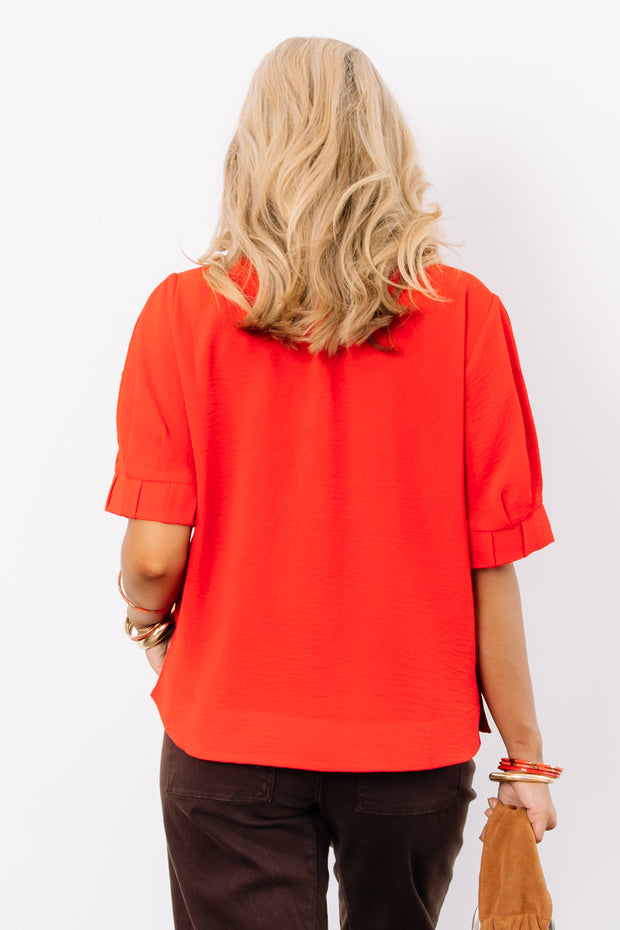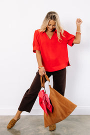 This tomato red short sleeve top is made from breathable, comfortable material, perfect for everyday wear. It features a flattering V neckline and small slits on the sides for added ease and style.